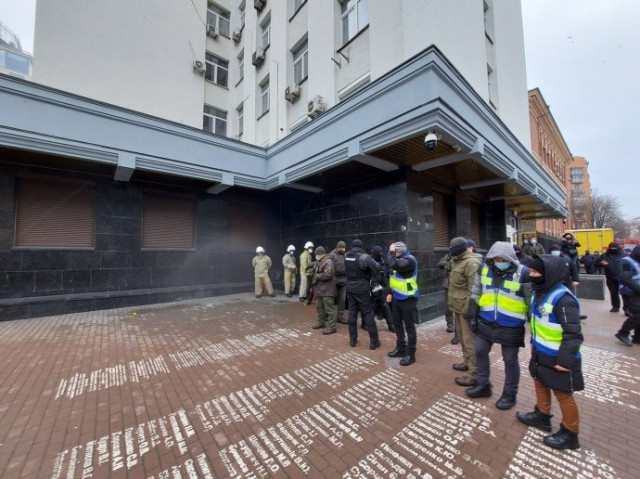 Потім будівлю Офісу генпрокурора закидали фаєрами.Поліція не втручається, на місці працюють пожежники.