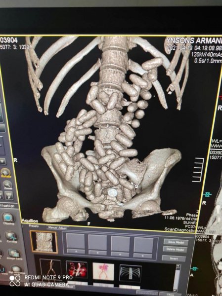 Під час проведення комп’ютерної томографії виявилося, що в його черевній порожнині знаходиться 91 овальна капсула з невідомою речовиною.
