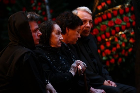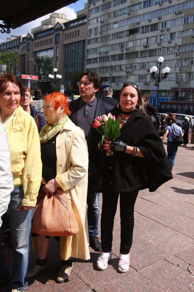 Близько 10:00 до театру під'їхав білий мікроавтобус. З автівки вийшла вдова Гнатюка 88-річна Галина Макарівна. Вона — філолог. З чоловіком у шлюбі прожила 66 років. Її супроводжував син 65-річний Андрій Гнатюк. Він очолює кафедру іноземних мов Київського університету.