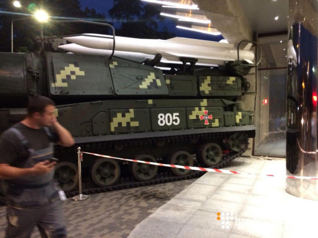 На вулиці Ярославській у Києві зенітна установка «Бук», яка брала участь у репетиції військового параду до Дня незалежності, врізалася в будівлю бізнес-центру.