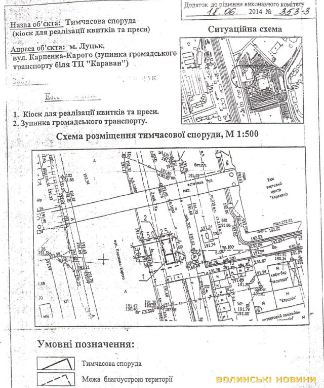 «Я не знаю, звідки взялась ця схема, бо вона неправильна», - каже пані Людмила і демонструє затверджений паспорт прив’язки та ситуаційну схему. Відповідно до неї, кіоск знаходиться так, як цього вимагає схема.