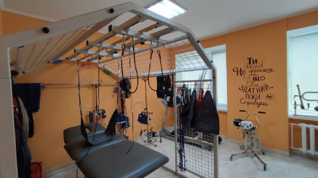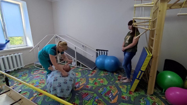 У Луцькій міській дитячій поліклініці осучаснили комплекс реабілітаційно-відновлювальних процедур. Зокрема, у кімнаті кінезотерапії є обладнання, на якому працюють діти з церебральним паралічем.