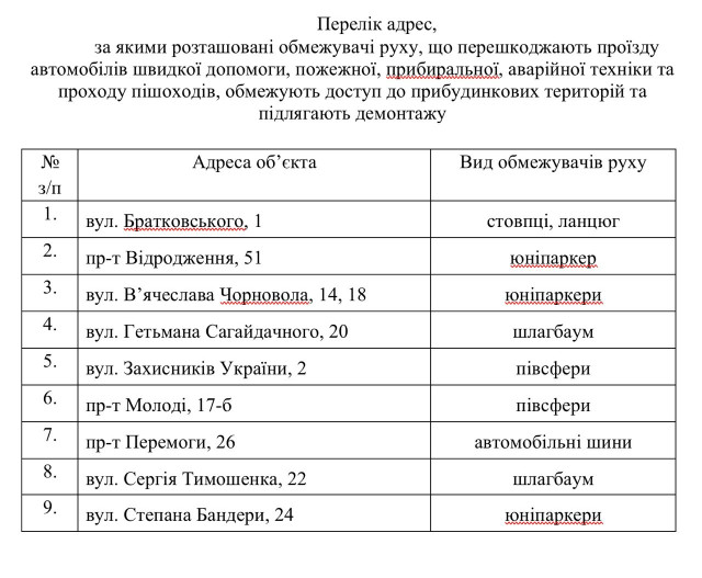 У місті демонтують кілька обмежувачів руху, які перешкоджають проїзду автомобілів швидкої допомоги, пожежної, прибиральної, аварійної техніки та проходу пішоходів, обмежують доступ до прибудинкових територій.