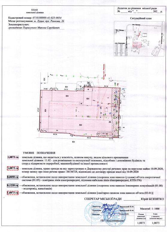 Земельну ділянку комунальної власності несільськогосподарського призначення на вулиці Ранковій,26 у Луцьку площею 1,0873 га продали Парасуньку Миколі Сергійовичу, затвердивши ціну продажу в розмірі 3 мільйонів 865 тисяч 921 гривні.