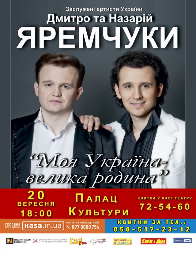 Дмитро та Назарій Яремчуки, заслужені артисти України побувають у Луцьку з концертом в рамках всеукраїнського та міжнародного туру “Моя Україна - велика родина”. Захід відбудеться 20 вересня у Палаці культури міста. Початок - о 18:00.