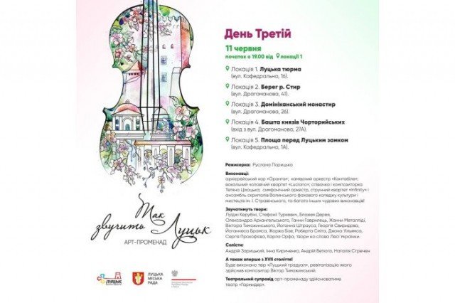 Третій день відкриє для глядачів нові локації старого Луцька на фоні чудової музики.Нагадаємо, перший день променаду звучав музикою Реквієму Луїджі Керубіні на фоні костелу, архітектуру якого створив Джакомо Бріано.