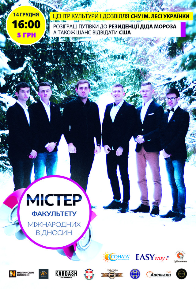 «Друзі! Запрошуємо вас відвідати чудову подію, під час якої 6 справжніх мужчин боротимуться за титул Містера Факультету міжнародних відносин! Чекатимемо вас 14.12 о 16:00 в Центрі культури та дозвілля СНУ!», - кажуть студенти.