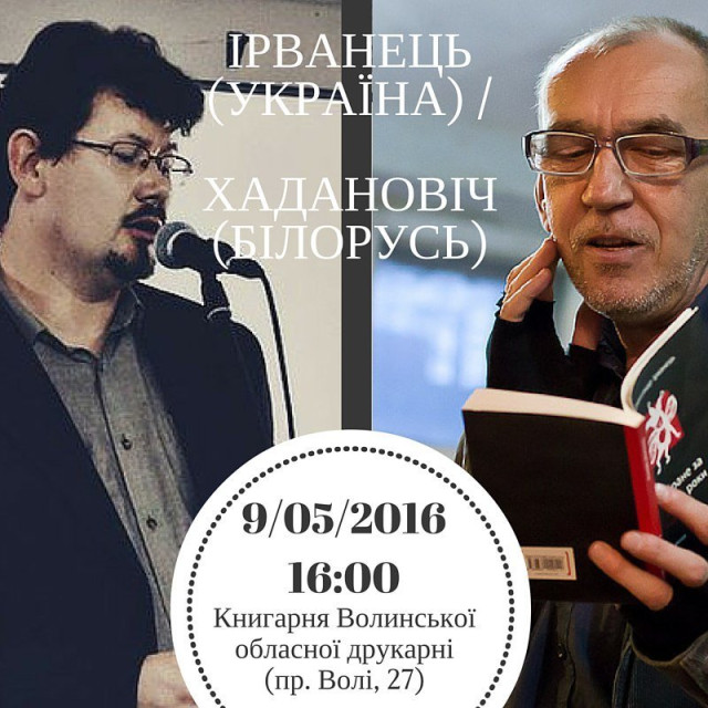 Визнані поети, українець та білорус, Олександр Ірванець та Андрей Хадановіч зустрінуться у Луцьку. Захід відбудеться 9 травня, о 16:00. Місце зустрічі – Книгарня Волинської обласної друкарні (пр. Волі, 27, вхід з вул. Сенатора), - повідомляють організатори.