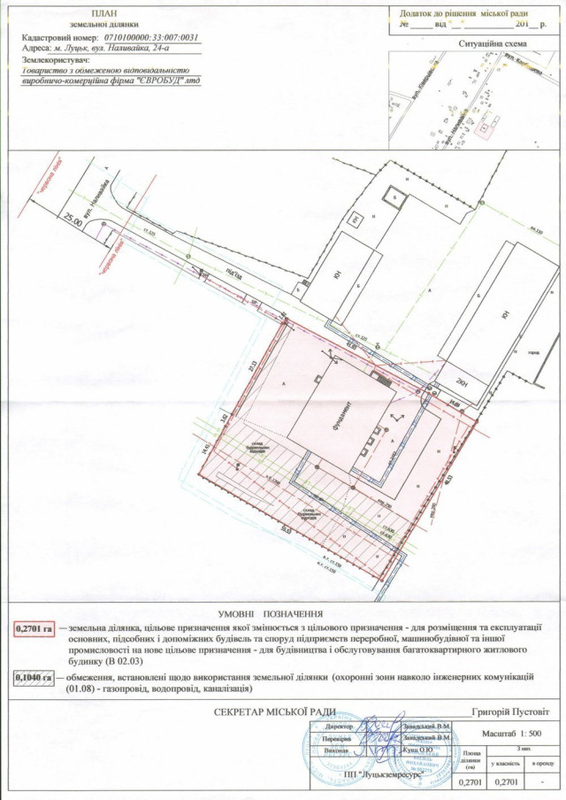 На розгляд депутатів винесли проект рішення Про затвердження товариству з обмеженою відповідальністю виробничо-комерційній фірмі «Євробуд» ЛТД проекту землеустрою щодо відведення земельної ділянки (зміна цільового призначення) для будівництва і обслуговування багатоквартирного житлового будинку на вулиці Наливайка, 24а.