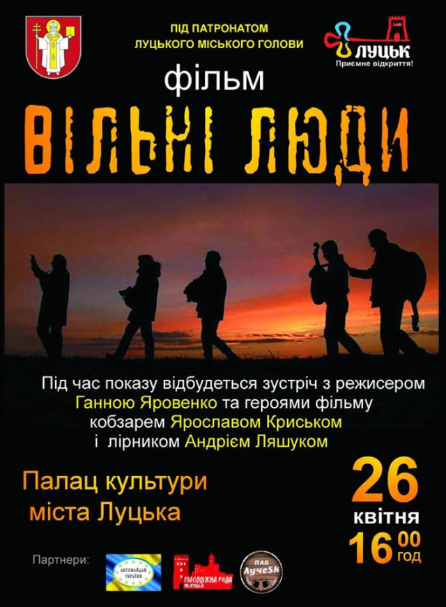 26 квітня о 16 годині в Палаці культури міста Луцька відбудеться показ фільму "Вільні люди", а також зустріч з режисером - Ганною Яровенко та героями фільму - кобзарем Ярославом Криськом та лірником Андрієм Ляшуком! Про це інформують організатори.
