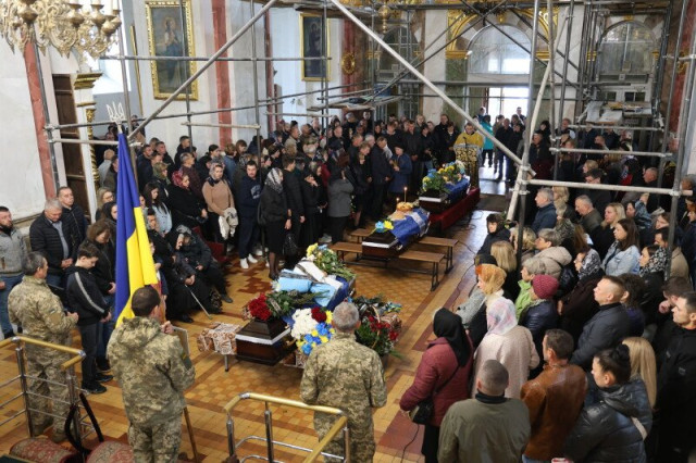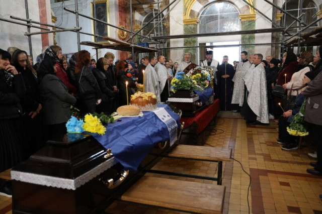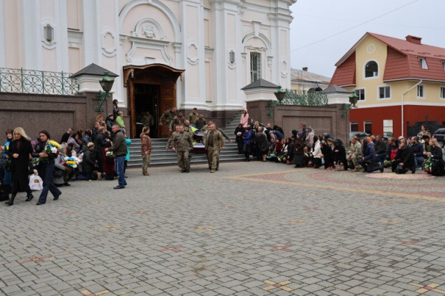Після завершення богослужіння труни з тілами захисників пронесли Театральним майданом. Біля фотостенду пам’яті загиблих Героїв присутні зупинилися і виконали Державний Гімн України.