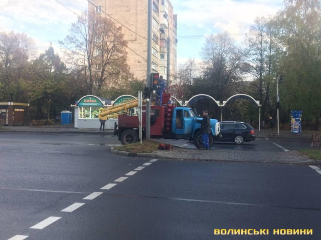 Працівники «Луцьксвітла» ремонтують світлофор на перехресті вулиці Воїнів Інтернаціоналістів та проспекту Соборності.