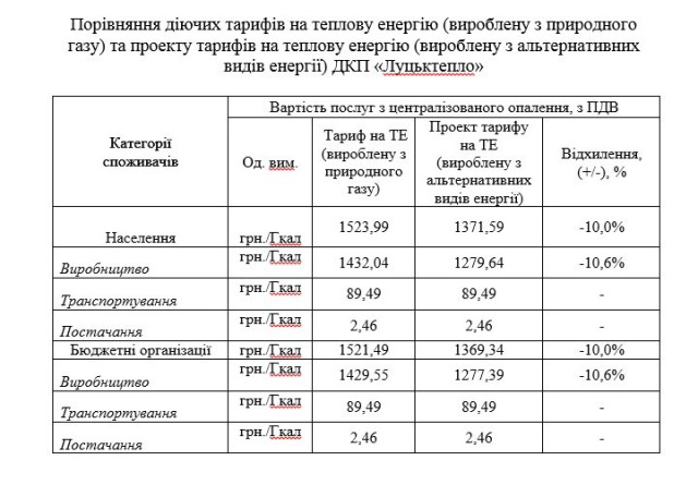 Тарифи на виробництво теплової енергії для потреб установ та організацій, що фінансуються з державного чи місцевого бюджету, а також для потреб населення визначають для підприємства, що здійснює виробництво теплової енергії на установках з використанням альтернативних джерел енергії, як різниця між тарифом на теплову енергію, і тарифами на транспортування та постачання теплової енергії, що визначають на рівні діючих для ДКП «Луцьктепло» тарифів на транспортування та постачання теплової енергії, виробленої з використанням природного газу, для потреб відповідної категорії споживачів.