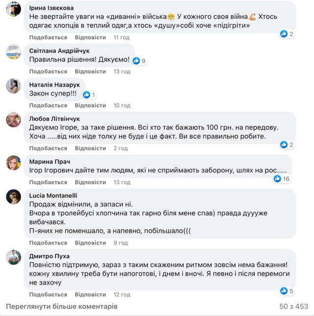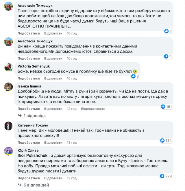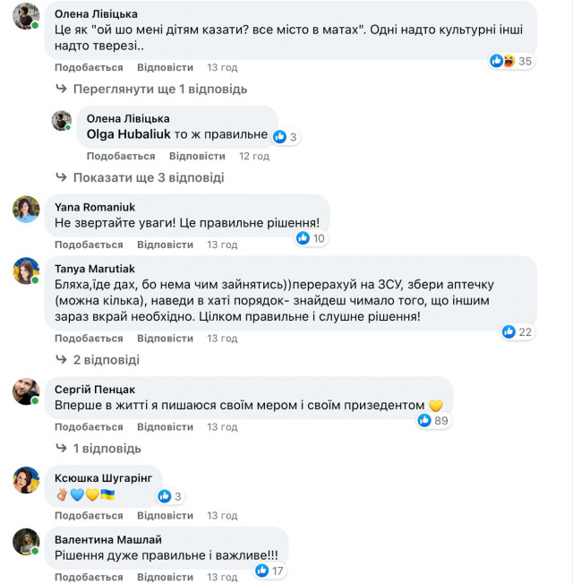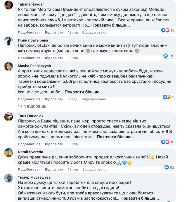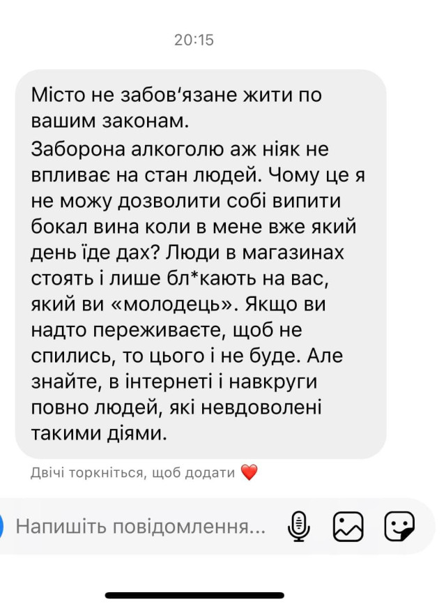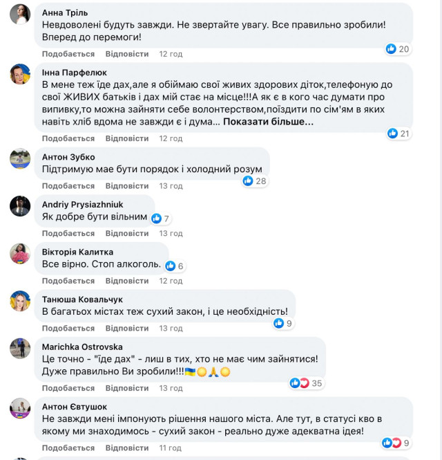 «Якщо ви надто переживаєте, щоб не спились, то цього і не буде. Але знайте: в інтернеті і навкруги повно людей, які невдоволені такими діями», – зазначено в одному з повідомлень, яке мер опублікував на своїй сторінці у Facebook.«Ось такі повідомлення отримую від тих, хто страждає від тимчасового «сухого закону», який введено моїм розпорядженням у зв’язку з воєнним станом.