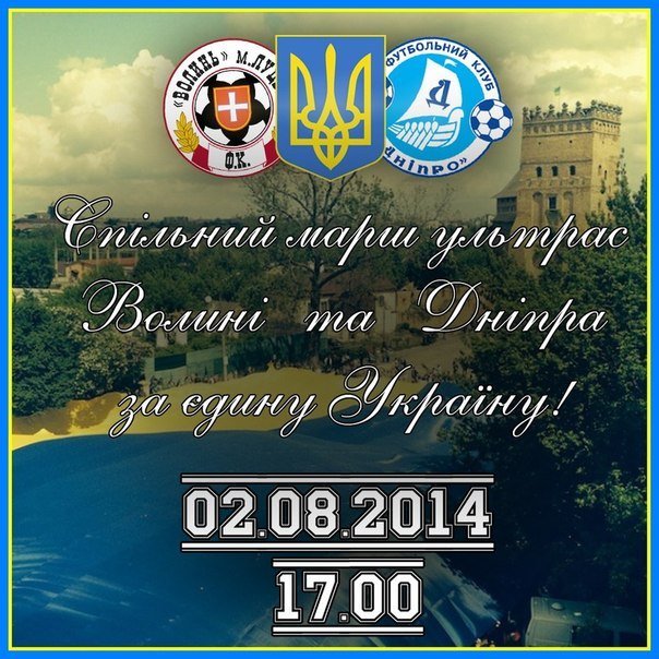 Спільний марш єдності ультрас «Волині» та «Дніпра» відбудеться у Луцьку. Марш у підтримку єдиної України стартуватиме 2 серпня від Замкової площі. Початок - о 17:00.