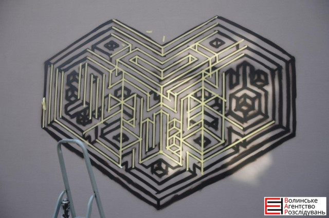 Максим ТікТак з Одеси малює геометричне серце, у якому зашифроване слово Луцьк. Графіті розміщене на вулиці Крилова, 4.