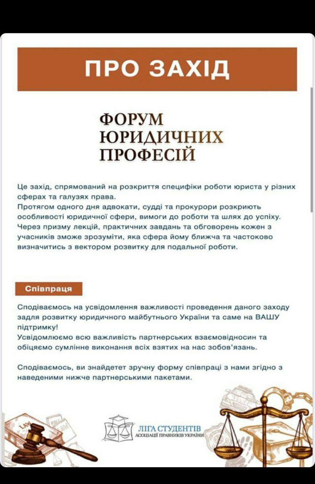 Загалом, форум юридичних професій спрямований на розкриття специфіки роботи юриста у різних сферах та галузях права. Протягом одного дня адвокати, судді та прокурори розкриють особливості юридичної сфери, вимоги до роботи та шлях до успіху. Через призму лекцій, практичних завдань та обговорень кожен зможе зрозуміти, яка сфера йому ближча та частково визначитись з вектором розвитку для дальшої роботи.