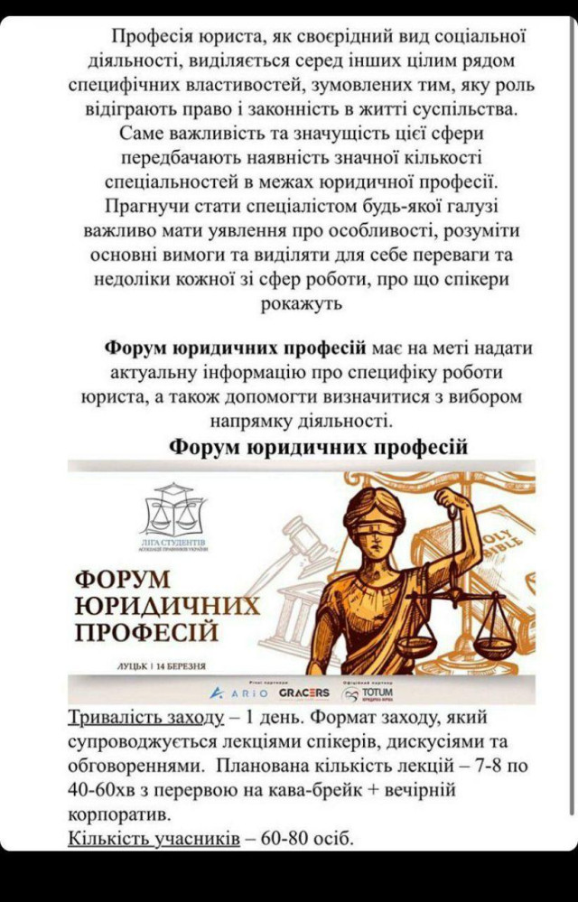 «Тематичний форум організовуємо не лише для студентів «правників». Теми і спікери будуть настільки цікавими, що будь-хто зможе взяти участь у форумі для загального розвитку», – кажуть організатори дійства.