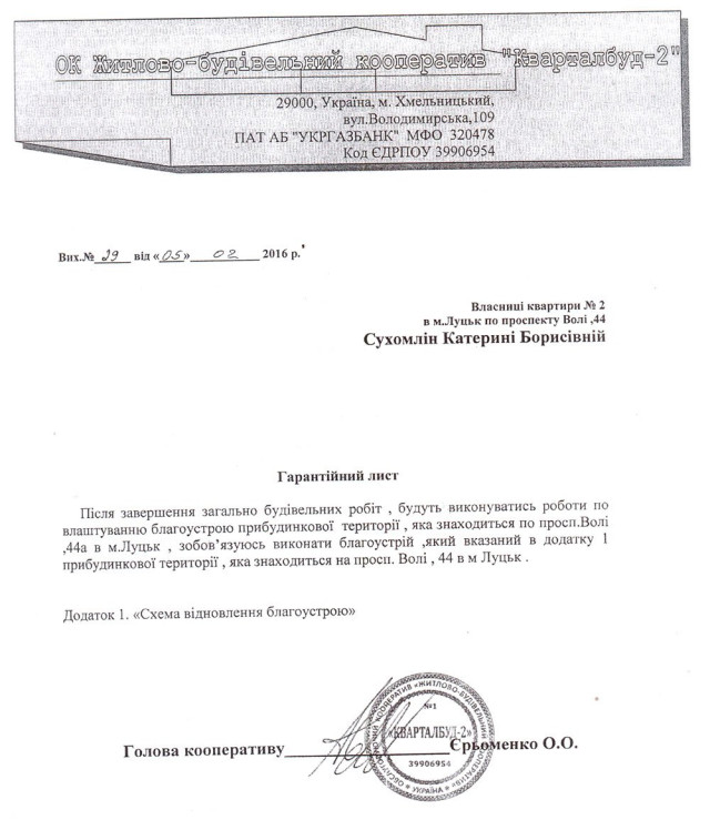Ким проводяться роботи, хто замовник та підрядник цих робіт — до кінця не зрозуміло. Згідно із Законом України «Про регулювання містобудівної діяльності» інформація про документ, що дає право на виконання будівельних робіт, а також відомості про категорію складності об’єкта будівництва, замовника та підрядників розміщуються на відповідному стенді, який встановлюється на будівельному майданчику в доступному для огляду місці. Всупереч закону на майданчику немає жодної інформації щодо цього будівництва.Під час виконання будівельних робіт невідомим забудовником була здійснена руйнація прибудинкової території, зняття бруківки, встановлено колію для крана. Жителі будинку по проспекту Волі, 44 звернулись зі скаргами у Луцьку міську раду та в управління державної архітектурно-будівельної інспекції, а натомість отримали відповідь від кооперативу «Житлово-будівельний кооператив «Кварталбуд-2». У цьому листі голова кооперативу Єрьоменко О. О. зобов’язується відновити благоустрій прибудинкової території.Який стосунок має цей кооператив до будівництва та прибудинкових територій — не зрозуміло.