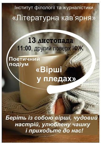 Літературна кав'ярня запрошує творчу молодь Луцька на поетичний подіум «Вірші у пледах». Про це у мережі Фейсбук повідомляє Наталія Шульська.
