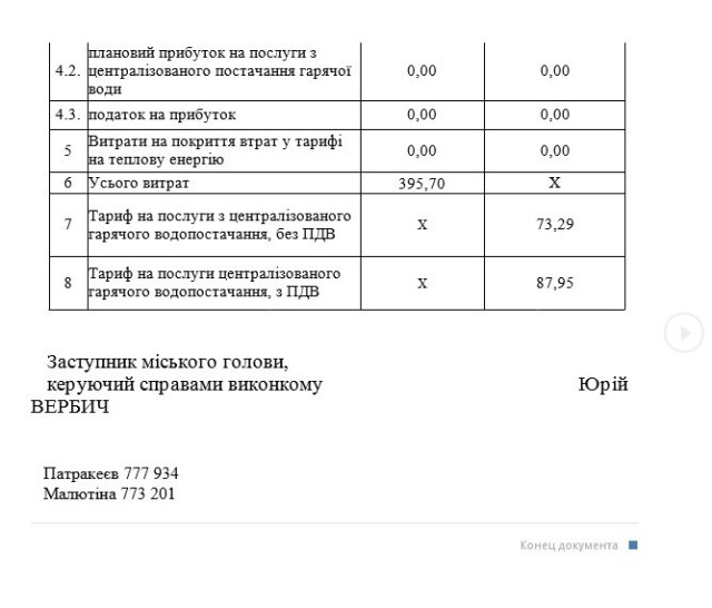 – для потреб установ та організацій, що фінансуються з державного та місцевого бюджету в розмірі 87,95 грн за 1 м3 (з ПДВ):Також виконком ухвалив рішення встановити ДКП «Луцьктепло» новий тариф на теплову енергію, вироблену з використанням альтернативних джерел енергії котельнею, що знаходиться на вулиці Боженка, 32: