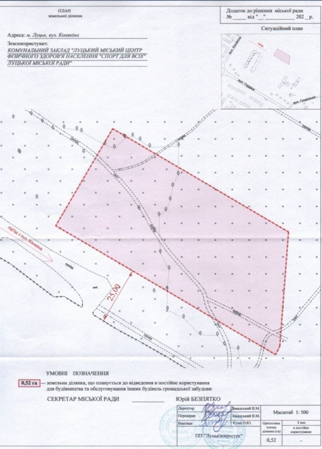 Як проінформував директор департаменту містобудування, земельних ресурсів та реклами Веніамін Туз, на земельній ділянці на вулиці Конякіна у Луцьку побудують стадіон. Площа наділу – 52 соті.
