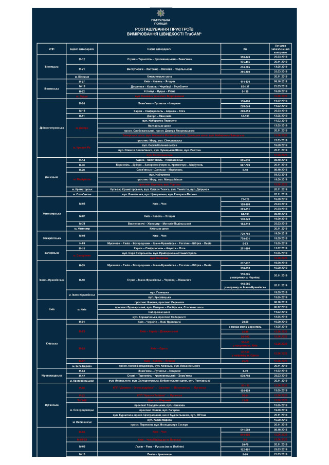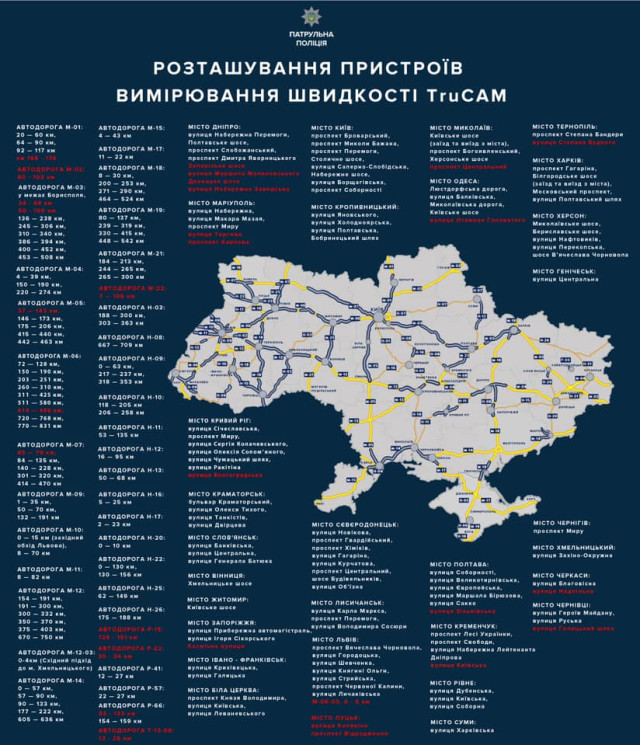 Усього на дорогах України працюватиме 115 приладів TruCAM, а вимірювання здійснюватиметься на 209 ділянках. Про це на своїй сторінці у фейсбуці написав заступник начальника департаменту патрульної поліції Олексій Білошицький.
