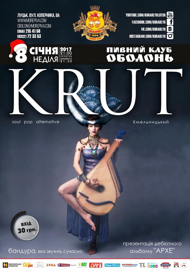 KRUT - це нове ім'я в українській музиці. Це яскравий гурт на чолі із ніжною та витонченою Мариною Круть. Ексклюзиву цій ватазі додає бандура, яка звучить сучасно у поєднанні із ніжним голосом та харизмою музикантів, в яких можна дуже легко закохатись!