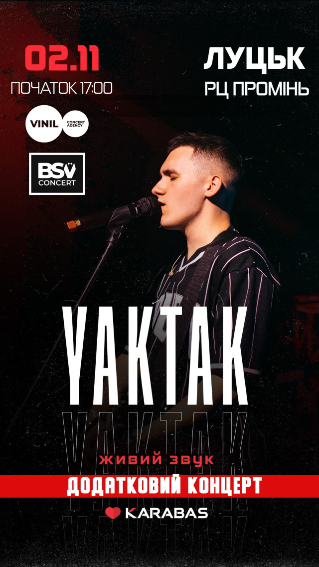 2 листопада о 17:00 та о 19:00 в РЦ «Промінь» у Луцьку вперше із живим бендом з великими сольними концертами виступить талановий та харизматичний YAKTAK. Події відбудуться у рамках осіннього концертного туру містами України.