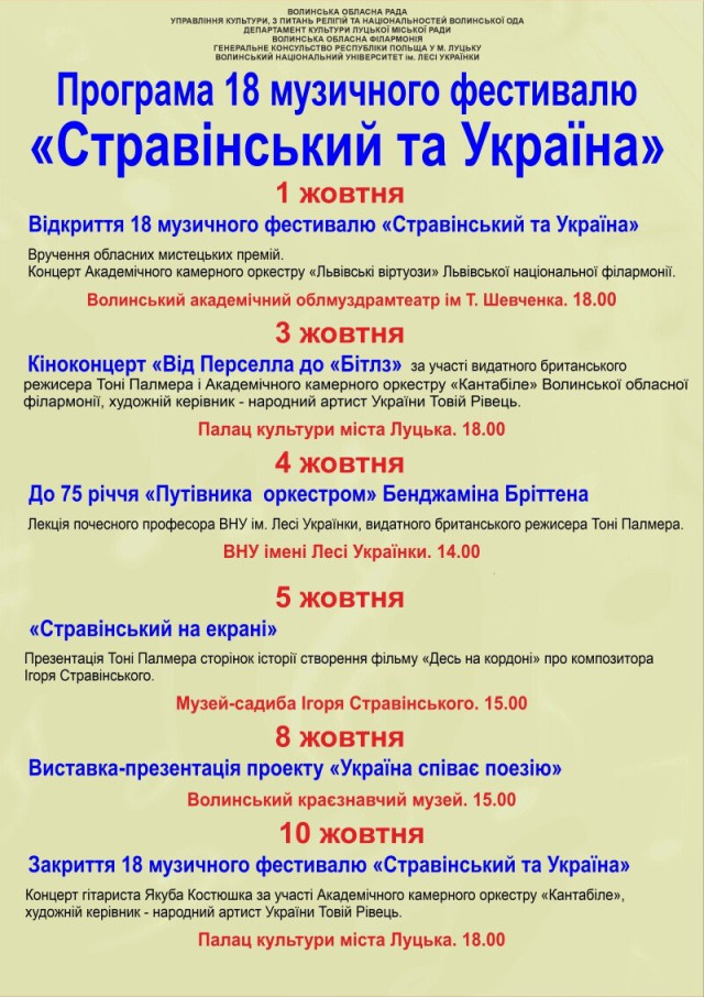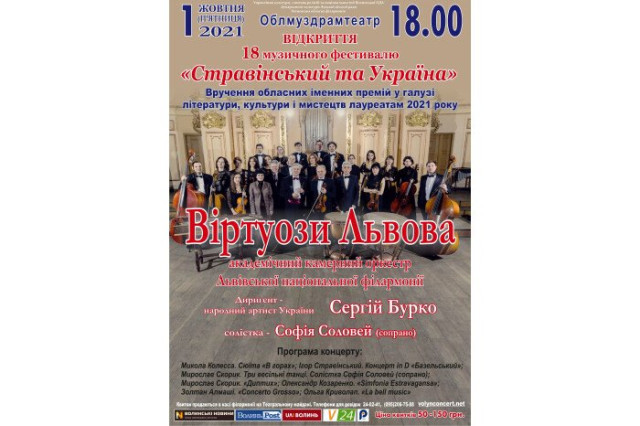 Розпочнеться фестиваль 1 жовтня о 18 год. в обласному музично-драматичному театрі ім. Т.Г.Шевченка концертом Академічного камерного оркестру «Віртуози Львова».