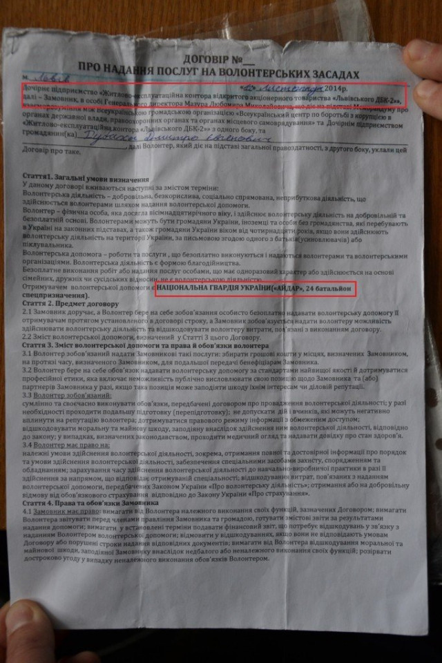 Та й достовірність документів у частині зв’язку волонтерів із збройними формуваннями можна легко поставити під сумнів. Так, у договорі про надання послуг на волонтерських засадах, який нібито укладали між ЖЕК ВАТ «Львівського ДБК-2» та збирачами йдеться: отримувачем волонтерської допомоги є НАЦІОНАЛЬНА ГВАРДІЯ УКРАЇНИ («АЙДАР», 24 батальйон спецпризначення).