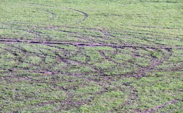 Колеса авто (однієї чи кількох) перелопатили газон. Тепер тут свіжі борозни, сліди від протекторів, повністю «лисі», без трави, ділянки футбольного поля, на якому щодня займається декілька команд дитячо-юнацької футбольної школи «Волині».