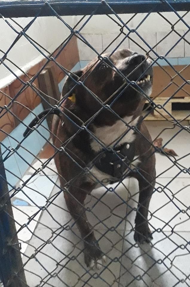 Як виявилось, це собака яку виставляли на боях. І от коли він програв – його пошматував інший собака і прокусив горло – від нього позбавились, віддали у притулок.