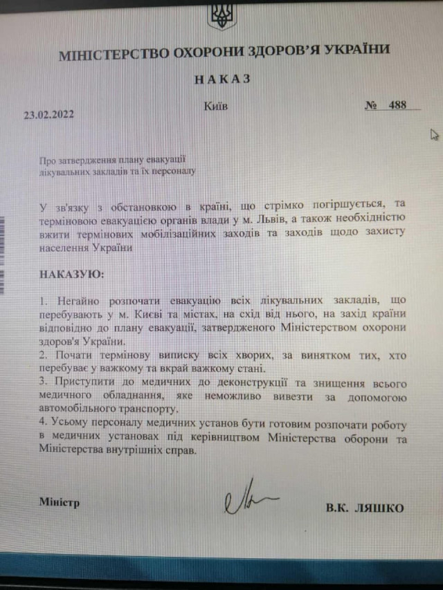 «Розповсюджується фейковий наказ Міністерства охорони здоров’я з начебто моїм підписом щодо затверджених заходів з евакуації у лікувальних закладах міста Києва та інших міст. Наголошую! Весь зміст неіснуючого наказу фейковий», – написав він.