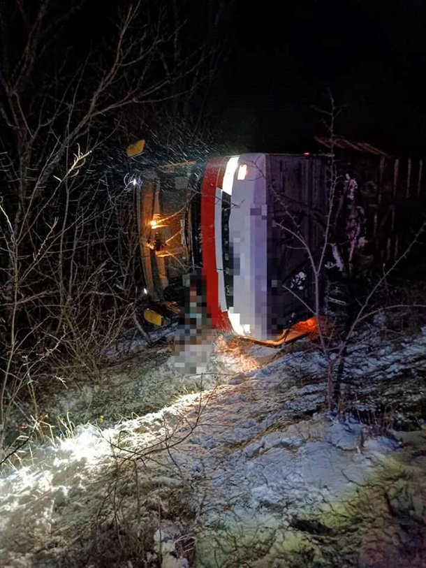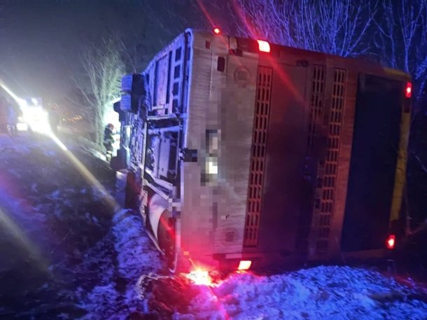 В автобусі перебував 21 пасажир. переважно українці. Ніхто не постраждав. Попередньою причиною ДТП стали тяжкі погодні умови. Через них автобус з’їхав з траси і перекинувся.