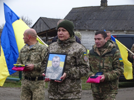 Мамі Лідії Іванівні та дружині Світлані вручили прапори і нагороди рідної їм людини, якими військове керівництво 14 окремої механізованої бригади посмертно нагородило солдата Сергія Попрійчука.