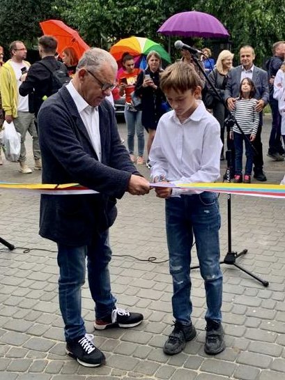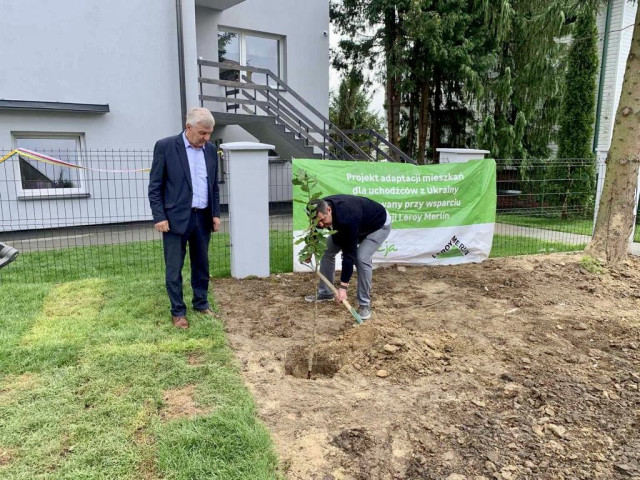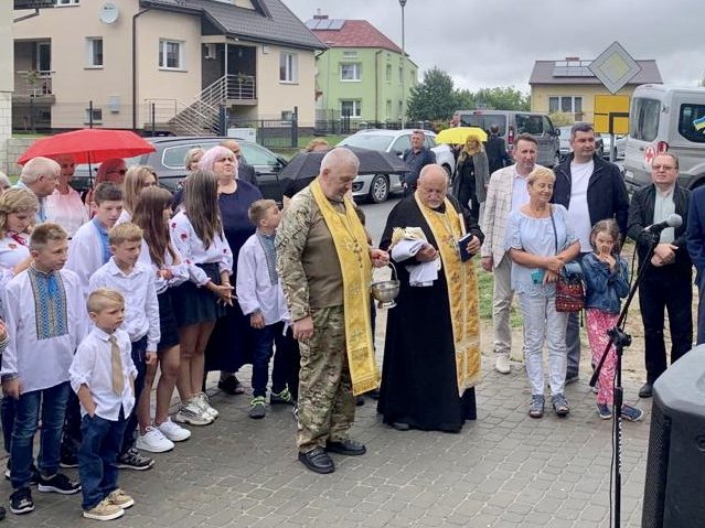На знак великої вдячності голові Фундації «Честь допомагати дітям» Пйотру Зигарскі Григорій Недопад подарував бойовий прапор 14-ї окремої механізованої бригади ім. князя Романа Великого, привезений з Куп’янська.«Просто так цей прапор не дарують людям. Його дарують лише тим, хто заслуговує на це. А ці хлопці, які розписали цей стяг, я переконаний, збережуть Україну і переможуть ворога», – наголосив він.На завершення присутні спільно помолитися за мир та підтримку усіх дітей в храмі Успіння Богородиці і Приснодіви Марії в Щебжешині.А також керівники Волиньради долучилися до висаджування поблизу нового будинку дерев як символа пам’яті та щирого добросусідства.