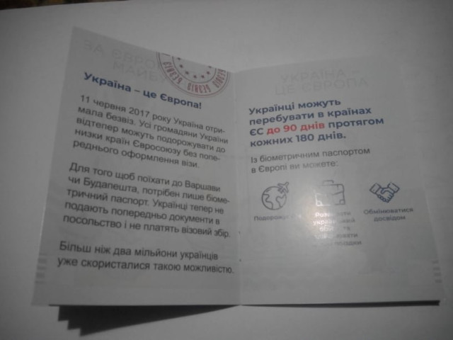 Буклет у вигляді українського закордонного паспорта містить на обкладинці зображення державного герба. На розвороті буклету розміщене фото Порошенка та його звернення, перелік європейських країн, з якими Україна має безвізовий режим та інформацію, яка стосується інтеграції до ЄС.
