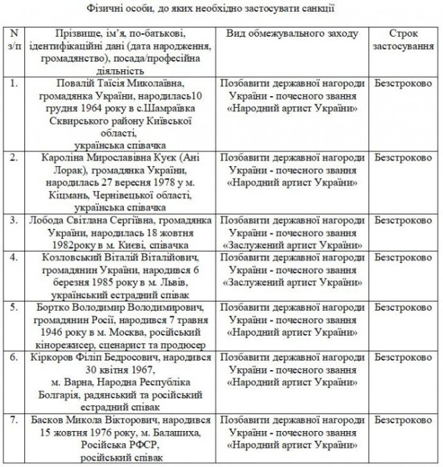Крім того, пропонується позбавити звання "народний артист України" російських співаків Філіпа Кіркорова й Миколу Баскова, а також російського кінорежисера, сценариста й продюсера Володимира Бортка.Додаток до проекту постанови ВР №9156