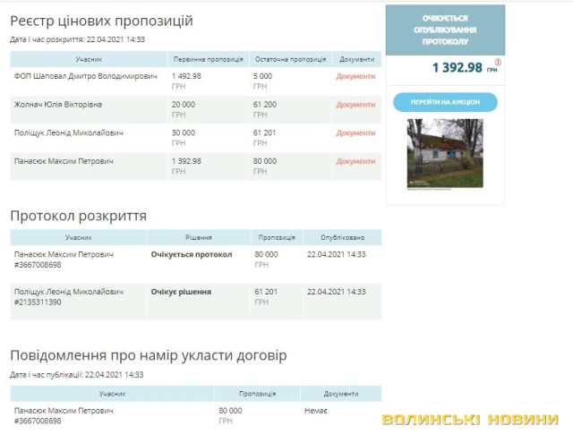 До слова, приміщення розташоване на земельній ділянці площею 0,36 га (кадастровий номер: 0724584600:01:001:0377), наданій в постійне користування для господарських потреб Рожищенській районній державній лікарні ветеринарної медицини.Аукціон з продажу приміщення відбувся 22 квітня. На торги подали документи четверо учасників: ФОП Шаповал Дмитро Володимирович (перша цінова пропозиція – 1 492.98 грн), Жолнач Юлія Вікторівна (20 000 грн), Поліщук Леонід Миколайович (30 000 грн) та Панасюк Максим Петрович (1 392.98 грн). На другому етапі всі учасники підняли пропозиції ціни. Причому троє – суттєво.