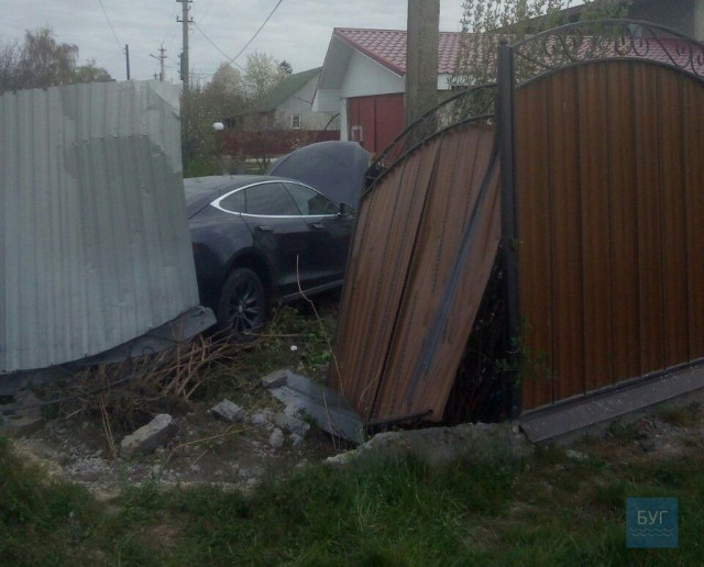 Так, на вулиці, яка веде до Лобачина, автомобіль Tesla темного кольору зніс кілька секцій паркану та електроопору.