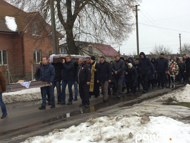 На дорозі, якою тіло померлого несли до церкви, вишикувались діти із жовто-блакитними прапорами. Процесію супроводжував духовий оркестр.