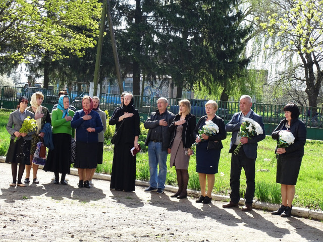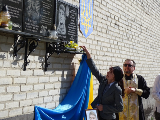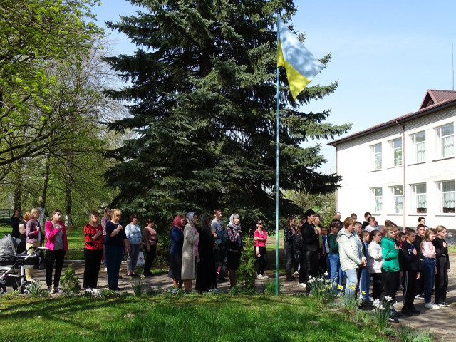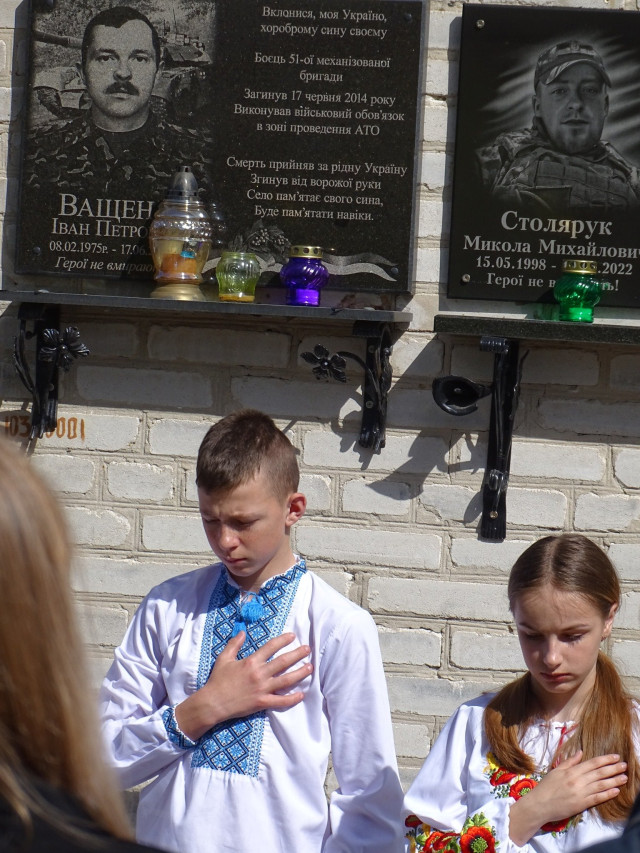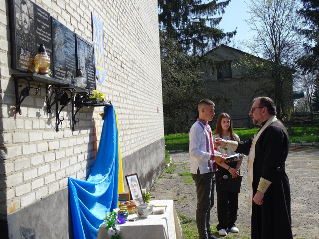Участь у відкритті меморіальної дошки взяли мама загиблого захисника, педагоги та учні, земляки, староста, представники місцевої влади.