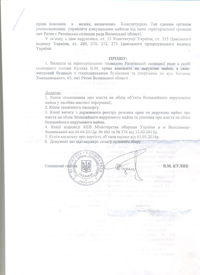 Із даного позову слідує що на початку 2012 року Ратнівською селищною радою на території ради було виявлено! безхазяйне нерухоме майно, а саме: житловий будинок з надвірними будівлями і спорудами! і це притому що В. Кулик є сільським головою з 2006 року лише у 2012 році виявив безхазяйне майно, хоча ще до появи В.Кулика у Ратному і у селищній раді кожен ратнівчанин знав, що цей будинок належить військовим.