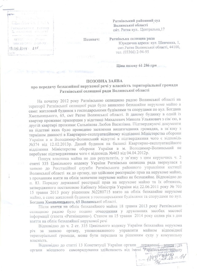 Так, до Ратнівського районного суду надійшов позов із здавалось би благою назвою про передачу безхазяйної нерухомої речі у власність територіальної громади Ратнівської селищної ради. Спершу нічого підозрілого не вбачається, якби мова не йшла про житловий будинок, який як кажуть у народі, усе життя належить військовій частині, що ще з радянських часів розташована в Ратному. В цьому будинку зареєстровані практично усі військові ратнівської частини із членами сімей, а це близько 40 чоловік, що потребують покращення житлових умов!
