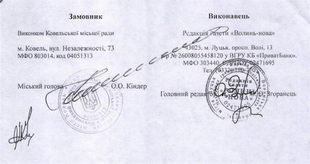 Попри те, що в акті здачі-прийому виконаних робіт з надання послуг від 18 вересня 2015 року замовником цієї газетної публікації значиться виконавчий комітет [ЄДРПОУ – 04051313, – ред.], чомусь роботи прийняті міською радою [ЄДРПОУ – 21735504] – абсолютно іншою юридичною особою, яка до договірних зобов’язань виконкому немає жодного стосунку. Стає незрозумілим, як таку фінансову оказію зареєструвало та взяло на облік Ковельське управління державної казначейської служби України Волинської області.