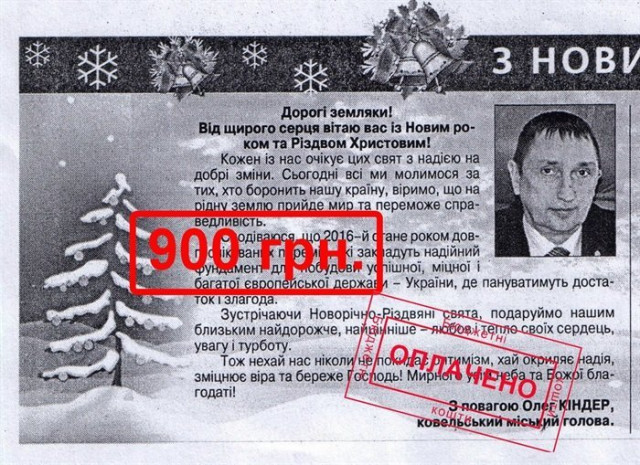 Новорічне вітання міського голови також вартує недешево. Проте і тут Олег Олексійович знову розрахувався бюджетними коштами. Як зауважують журналісти видання, мер від себе особисто привітав ковельчан із святом за їхні ж гроші.