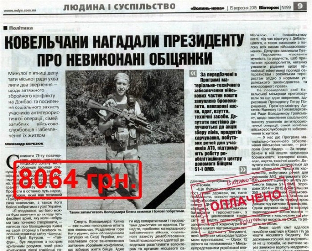 Ну, а тепер про вартість самих публікацій. Для прикладу, репортаж із позачергової сесії Ковельської міської ради, на якій депутати ухвалили два звернення до Президента України Петра Порошенка.