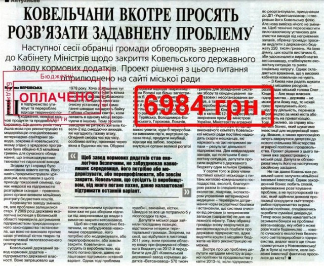 Дивним виглядає текст у рахунку з бухгалтерії: «За опублікування статті про роботу Ковельської міської ради щодо закриття Ковельського ветсанзаводу…»