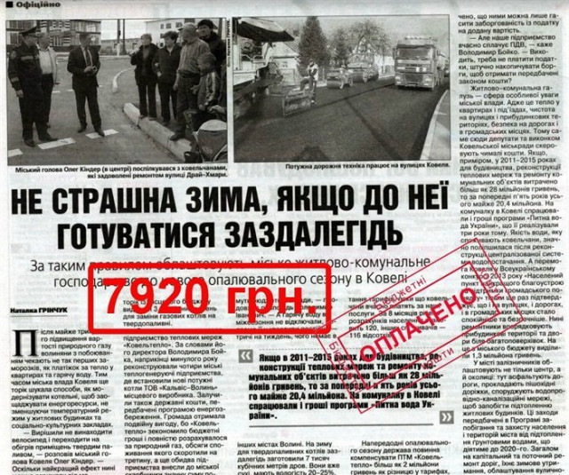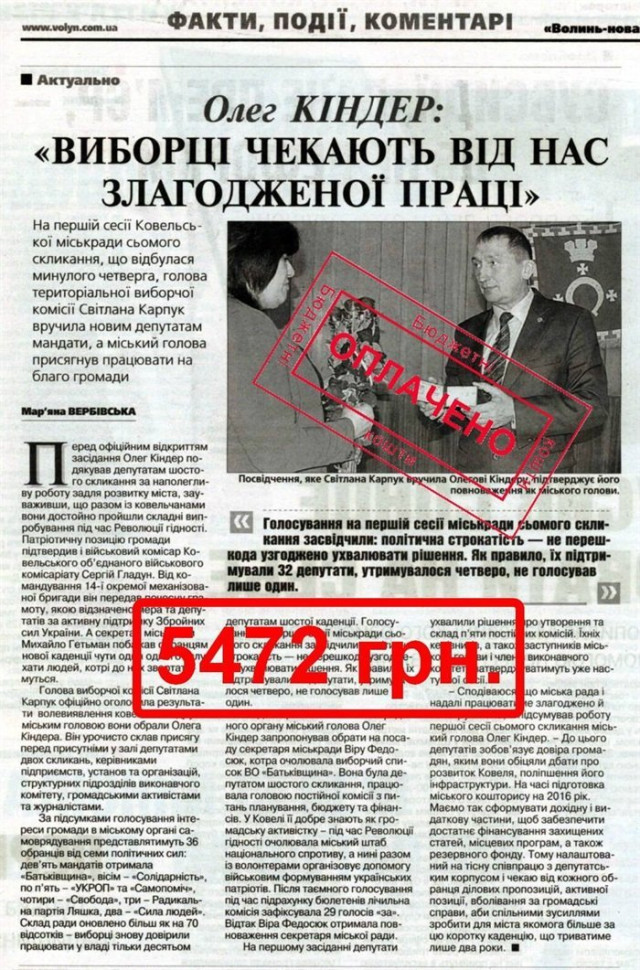 Зокрема, у вересні минулого року, якраз під місцеві вибори, на висвітлення піар-компанії «біло-сердечної» влади Олега Кіндера з кишень ковельчан виділили додатково 50 тисяч гривень. Як зазначає видання, таке цільове бюджетне фінансування адресоване виключно єдиному виданню – газеті «Волинь-нова», з якою співпрацює пенсіонерка, на той час депутатка Волиньради з фракції ВО «Батьківщина», а нині керівник прес-центру цієї обласної парторганізації Валентина Блінова. Свого часу Блінова балотувалася кандидатом до Волиньради по Ковелю, але вибори програла.